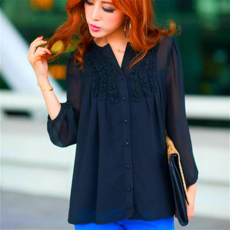 Goede Kopen Herfst Lente 4xl Vrouwen Big Size Oversized Shirts Kleding Zwarte Chiffon Blouse Chiffon Ruffle Blouse Harajuku zien door Goedkoop
