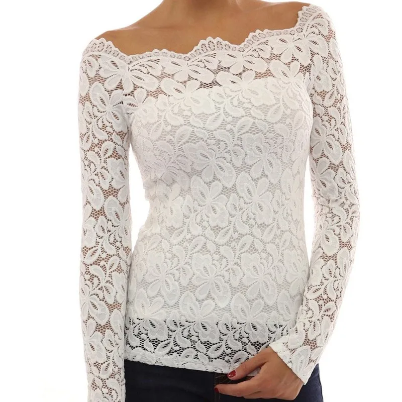 Kopen Goedkoop Herfst Lente Vrouwen Blouses Kant 2018 Zomer Zwart Wit Blauw Rood Off Shoulder Lange Mouwen Lace shirt Top Plus Size XXXL Blouse Prijs