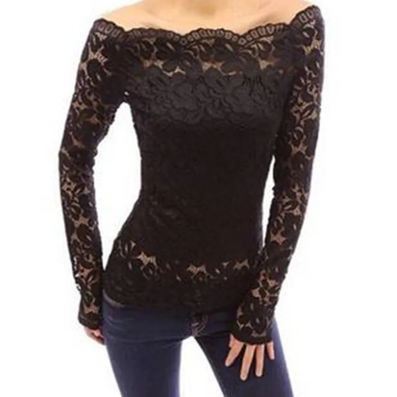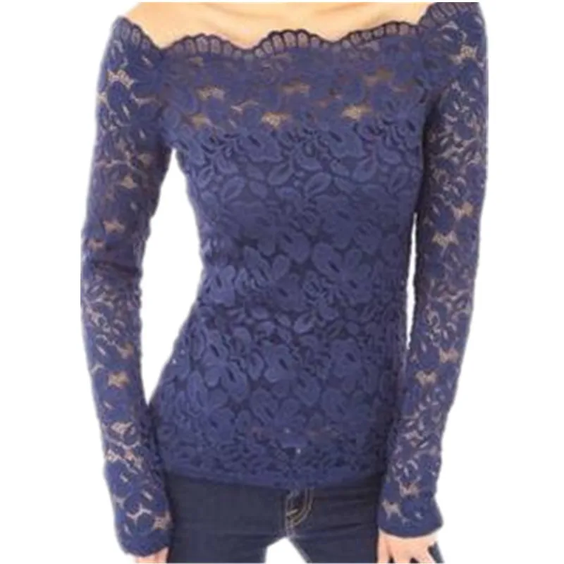 Goede Kopen Herfst Lente Vrouwen Blouses Kant 2018 Zomer Zwart Wit Blauw Rood Off Shoulder Lange Mouwen Lace shirt Top Plus Size XXXL Blouse Goedkoop.