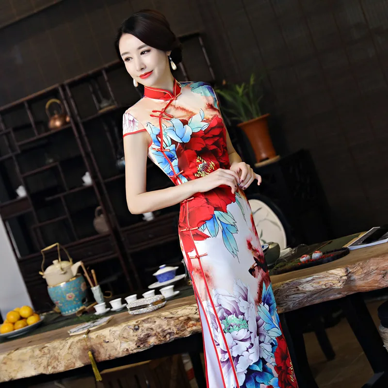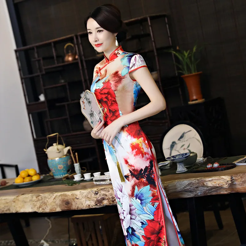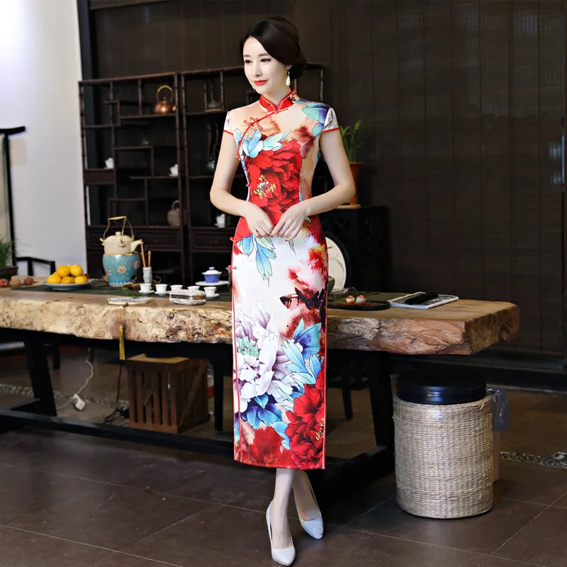 Kopen Goedkoop Nieuwe Lente Vintage Print Chinese Traditionele Vrouwen Satijn Jurk Sexy Lange Slanke Mandarijn Kraag Qipao Bloem Cheongsam M 3XL Online.